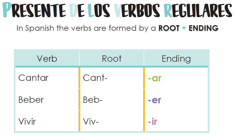 We already know that the infinitive is the name of a verb form that names the action of a verb. In English it is the root form of the verb, preceded by the word “to”. In Spanish, there are three groups of verbs, those whose infinitive ends in -AR, those that end in -ER and those that end in -IR.