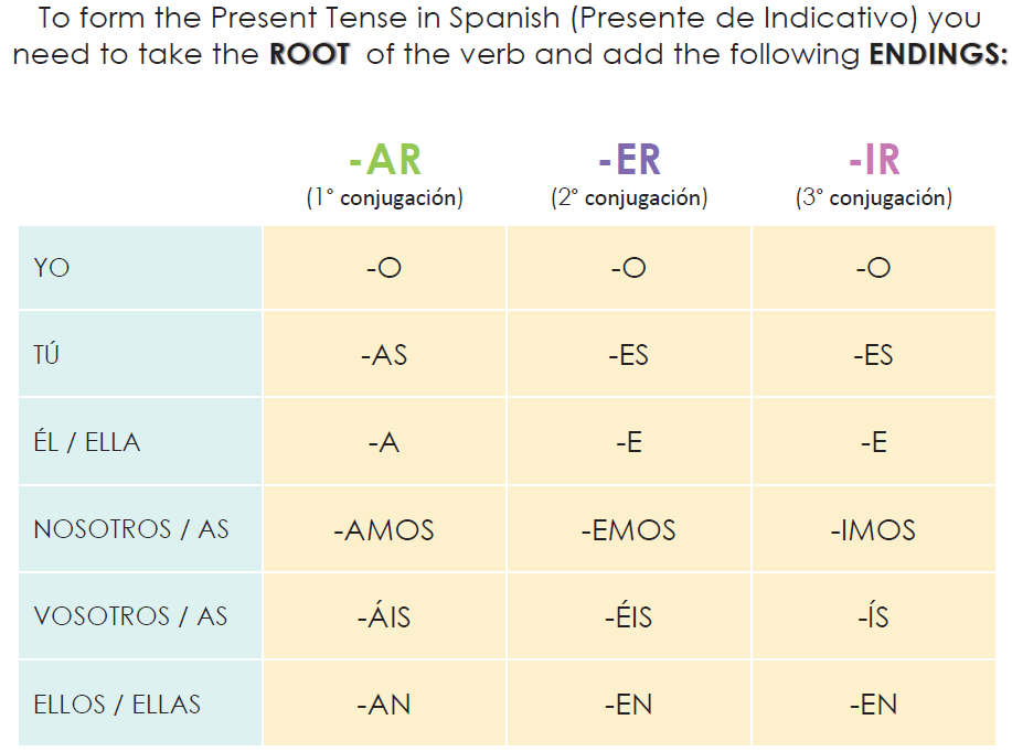 Ya sabéis que los verbos en español se conjugan de manera diferente según el sujeto de la acción. Y que hay tres grandes grupos de verbos dependiendo de la terminación del infinitivo. Now you know that Spanish verbs are conjugated differently according to the subject of the action and that there are three big groups depending on the infinitive ending.